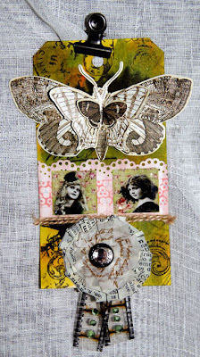 Her har jeg lagt tre sommerfugler oppå hverandre. Disse er stickers fra ett hefte til Tim Holtz.