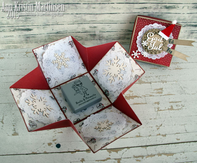I dag vil jeg vise deg to eksplosjonsesker jeg har pyntet for å gi bort en julegave i! Det passer jo supert med en smykke eske i midten av ett slikt kort!